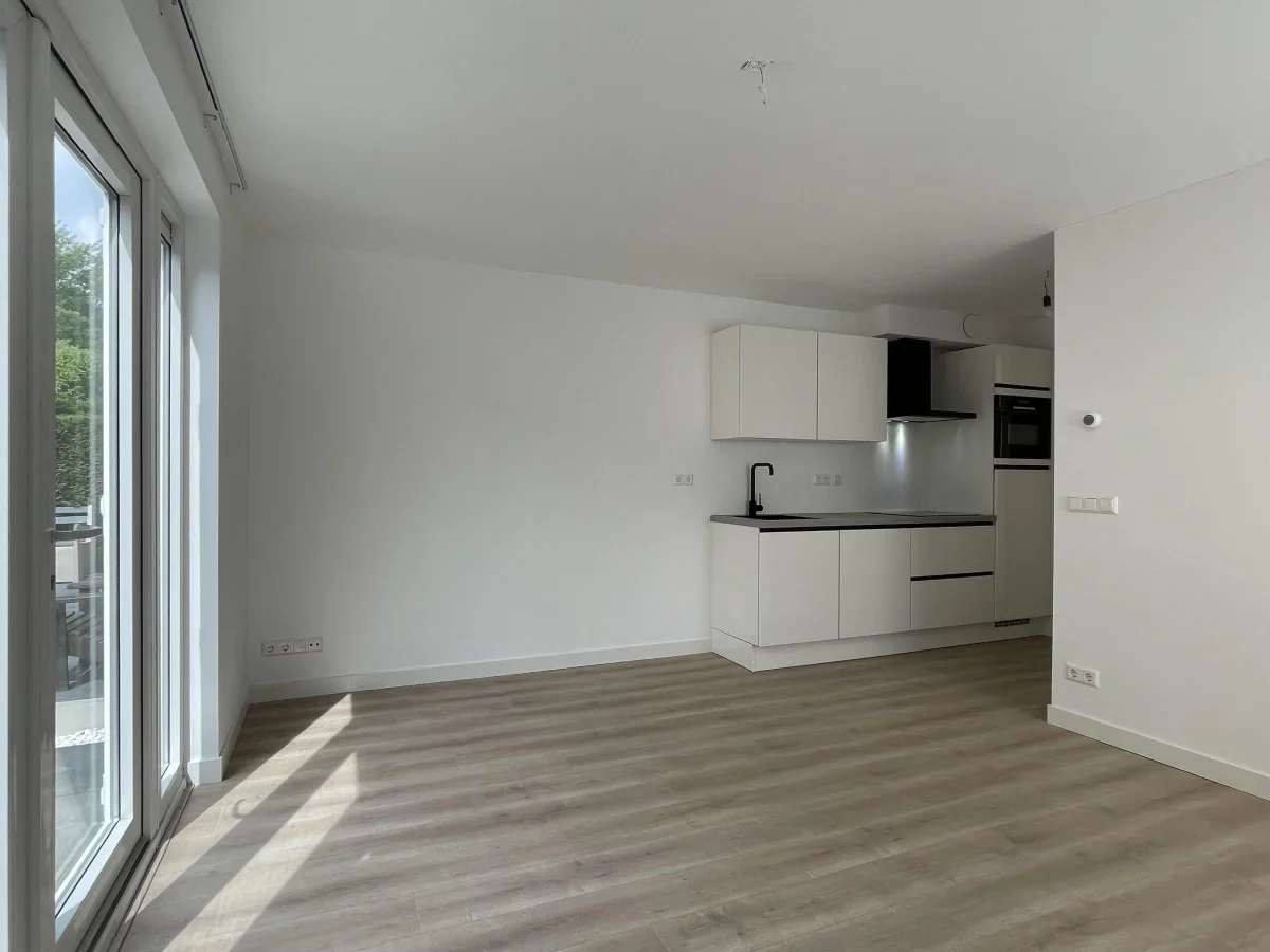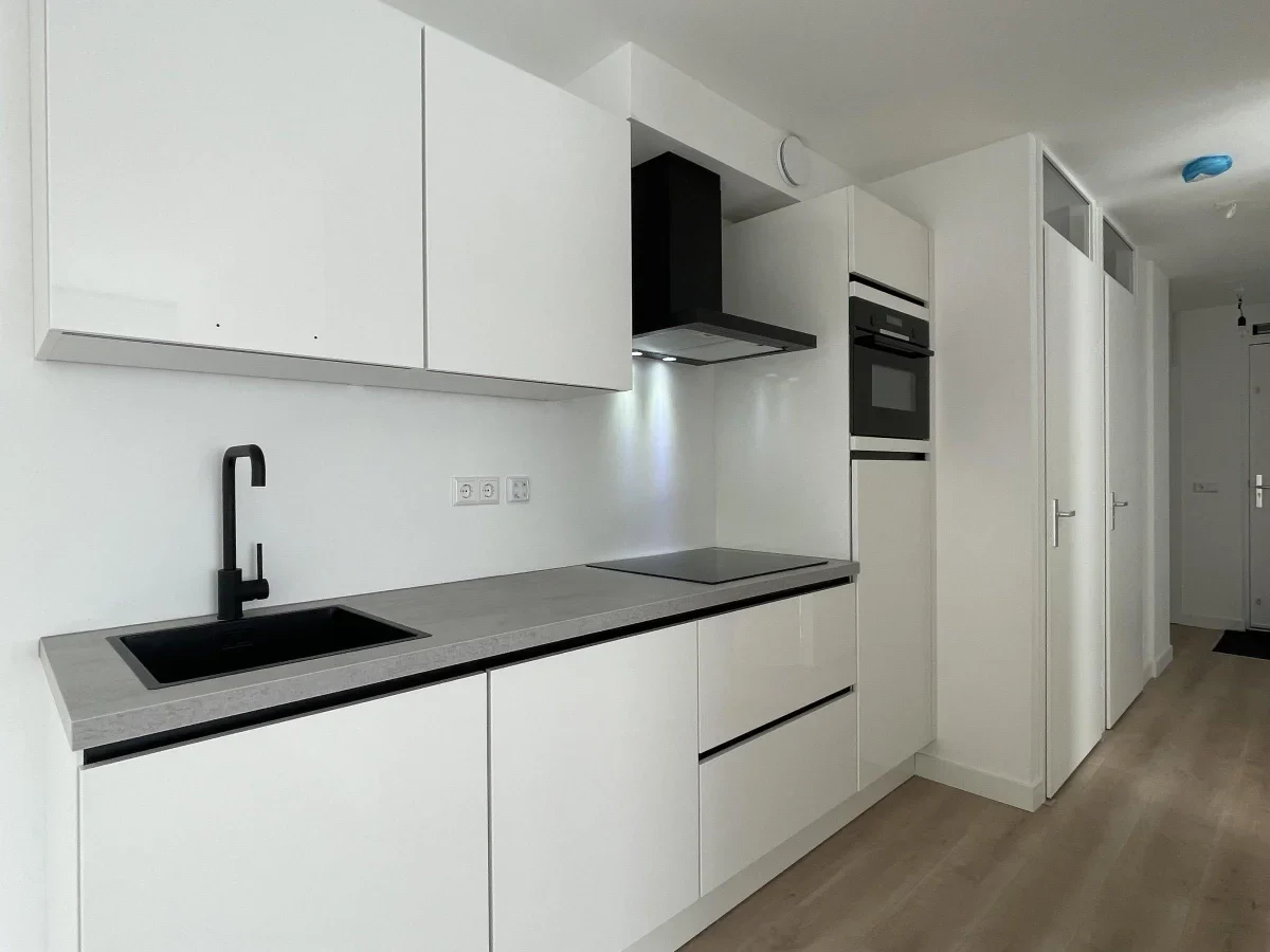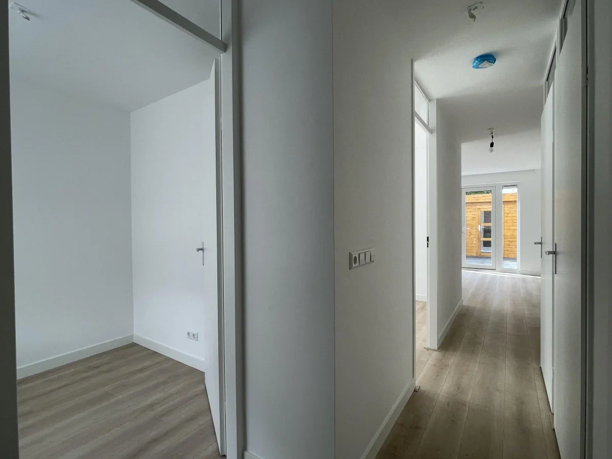 Bij binnenkomst in de woning betreedt u de entreehal, die toegang biedt tot alle vertrekken. De lichte woon- en eetkamer is royaal van opzet en beschikt over openslaande deuren die uitkomen op het zonnige terras. De keuken is voorzien van moderne inbouwapparatuur, waaronder een inductiekookplaat, afzuigkap, vaatwasmachine, combimagnetron en koelkast. De woning beschikt over twee slaapkamers van verschillende grootte. De kleinere kamer is uitstekend geschikt als werkkamer of kastenkamer. De moderne badkamer is voorzien van een inloopdouche met glazen deuren en een stijlvol wastafelmeubel met spiegel. Er is een separaat toilet aanwezig, evenals een berging met aansluitingen voor wasmachine en droger.