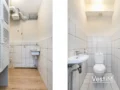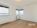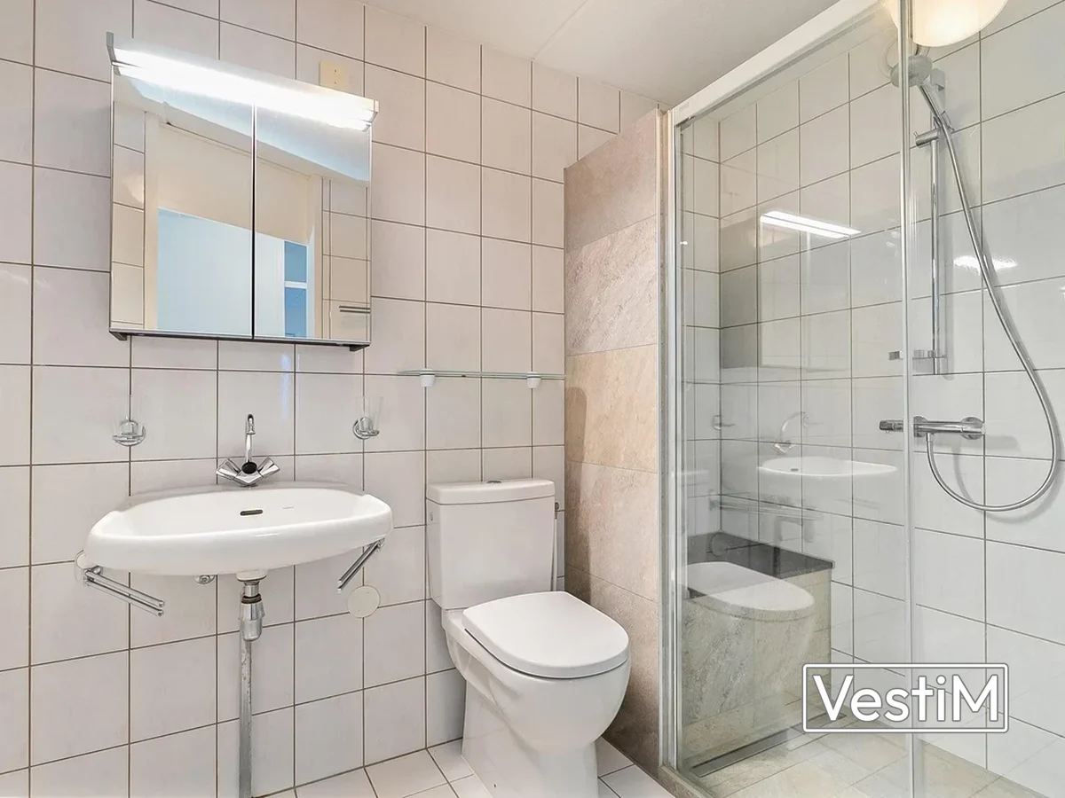 De halfopen keuken, grenzend aan de woonkamer, is uitgerust met voldoende kastruimte en diverse moderne inbouwapparatuur, waaronder een oven/magnetron, grote koelkast, vriezer, vaatwasser, inductiekookplaat en afzuigkap. De twee slaapkamers zijn in prima staat, waarbij de kleinere kamer perfect als kinder- of werkkamer kan dienen. De badkamer, bereikbaar vanuit de hal, beschikt over een wastafel, grote spiegel, afgesloten douchecabine en is volledig betegeld tot aan het plafond.