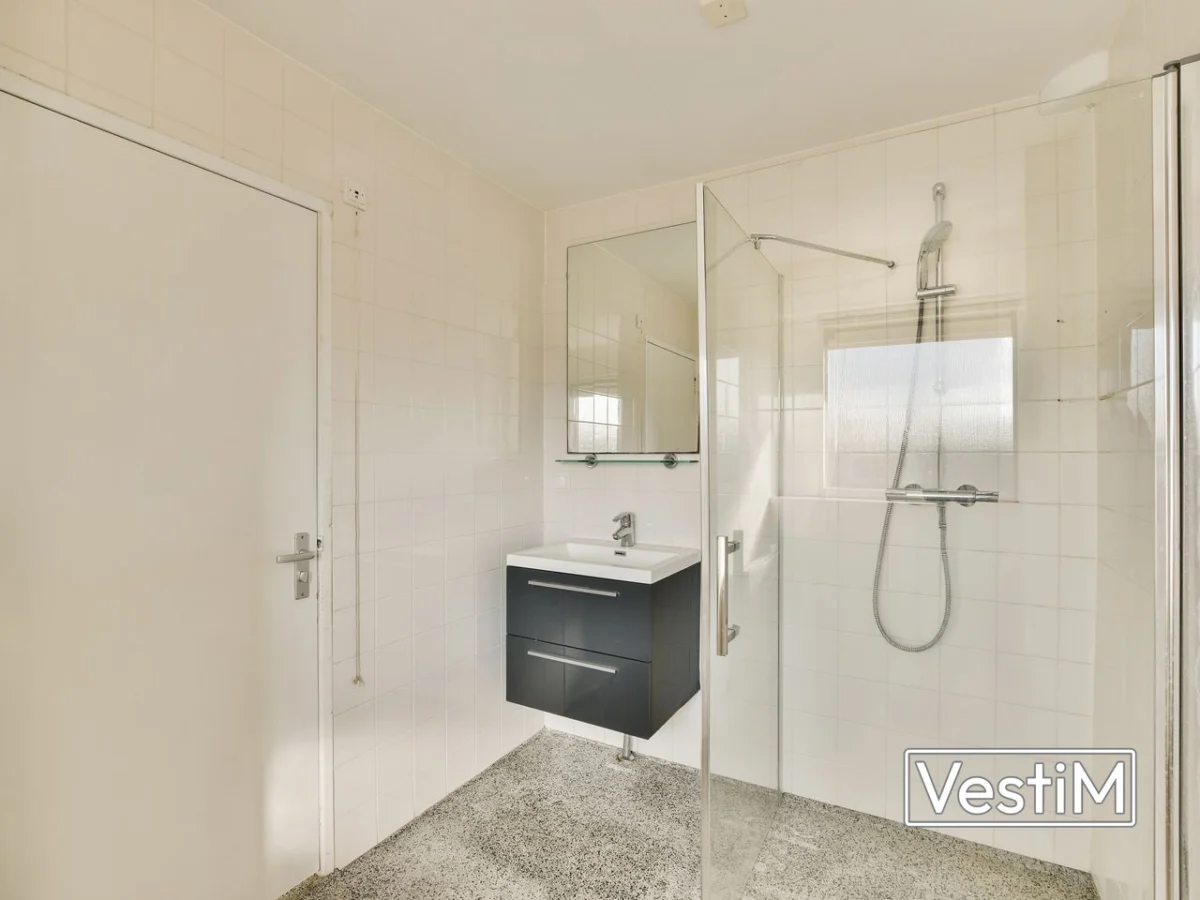 - Badkamer met douche en wastafelmeubel; aansluitingen voor wasmachine en droger
