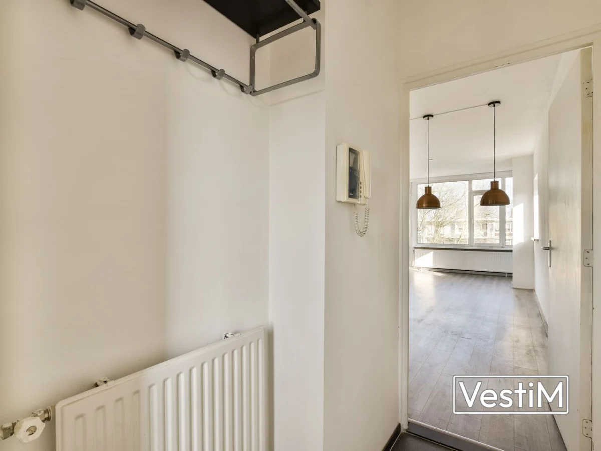 Entree in de hal met meterkast en toegang tot de ruime living met open keuken. De keuken is royaal opgezet met veel werk- en bergruimte en een grote voorraadkast. Aan de rustige achterzijde ligt de masterbedroom met balkontoegang; de tweede slaapkamer grenst aan de galerijzijde. De indeling maakt het realiseren van een derde slaapkamer eenvoudig. De badkamer heeft een granieten vloer, witte wandtegels, een douche en een wastafelmeubel; hier bevinden zich ook de aansluitingen voor wasmachine en droger. Het toilet is separaat. Op de galerij is een kast met de cv-ketel (Intergas, 2010). In de onderbouw is een eigen berging aanwezig.