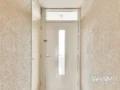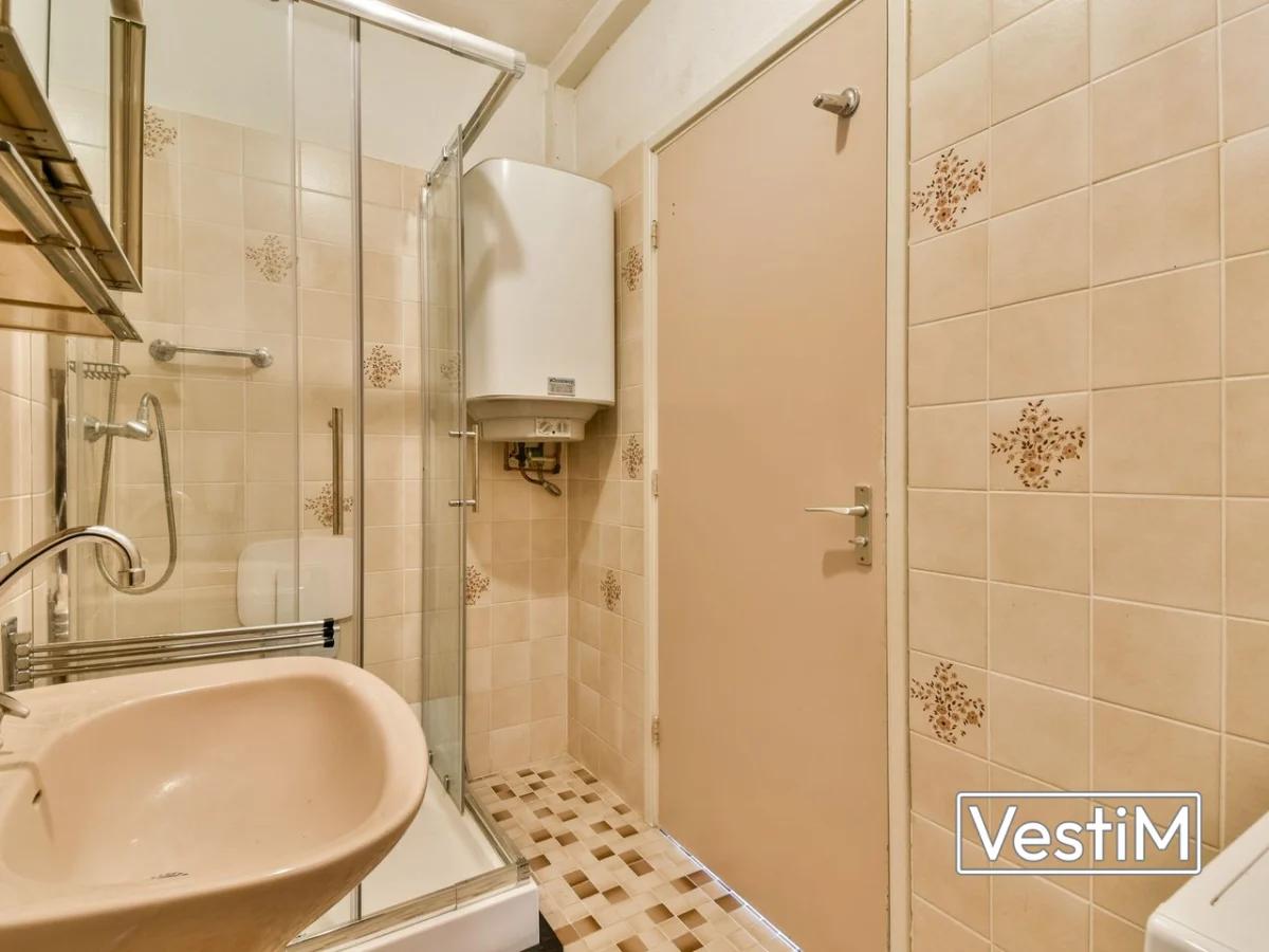 - Badkamer met douche, wastafelmeubel en wasmachineaansluiting