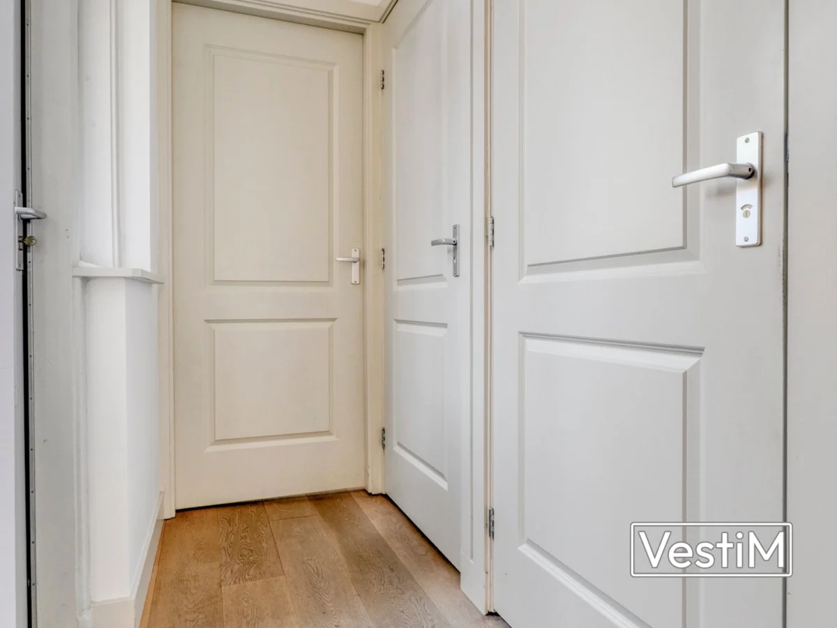 Indeling: gemeenschappelijke entree op de begane grond. De woonkamer met open keuken ligt aan de achterzijde en geeft toegang tot het balkon op het noordwesten. Aan de voorzijde bevindt zich de eerste slaapkamer met toegang tot het balkon op het zuidoosten. De tweede slaapkamer ligt aan de achterzijde. Er is een separaat toilet. De badkamer is uitgerust met inloopdouche, ligbad en wastafelmeubel. In de woonkamer is een praktische kast met wasmachineaansluiting. De indeling is efficiënt en goed doordacht.