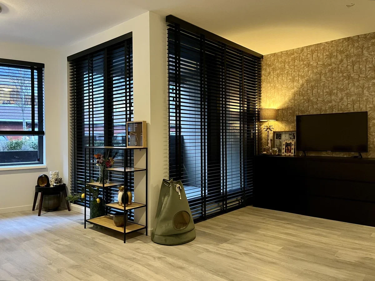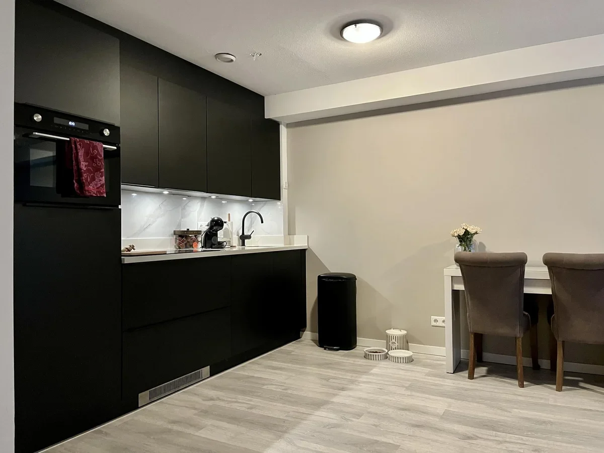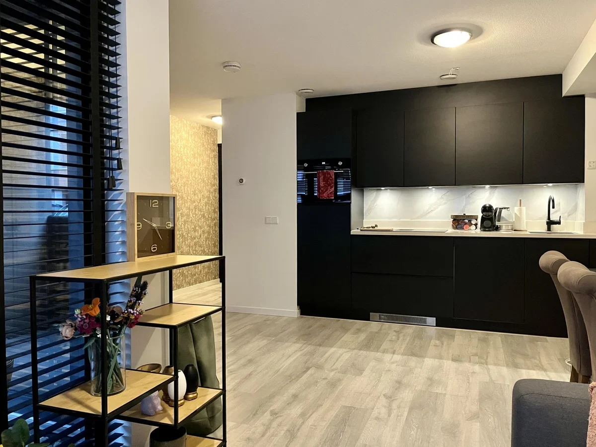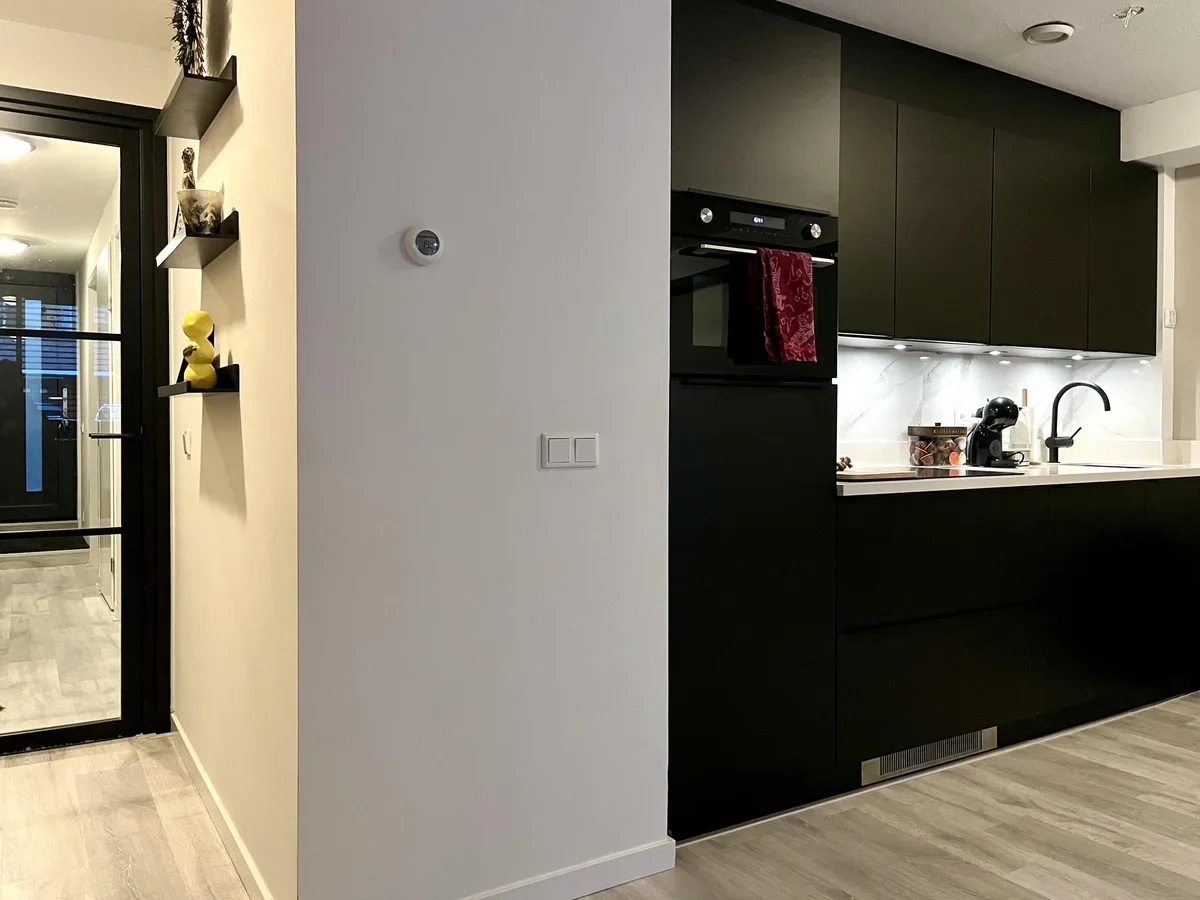 Indeling: Bij binnenkomst via de centrale toegangsdeur, die is voorzien van een intercomsysteem voor extra veiligheid, betreedt u een royale hal. Deze hal biedt toegang tot twee goed bemeten slaapkamers en een moderne badkamer. De badkamer is uitgerust met een inloopdouche, toilet en een stijlvol wastafelmeubel. Daarnaast is er een kast aanwezig die ruimte biedt voor de opstelling van de CV-ketel, de verdeler van de vloerverwarming, een mechanische ventilatiebox en aansluitingen voor zowel een wasmachine als een droger. De woonkamer is ruim en licht en beschikt over een moderne zwarte open keuken die van alle gemakken is voorzien, zoals een inductiekookplaat, vaatwasser, inbouwkoelkast en een combimagnetron/oven. Er is voldoende ruimte voor een comfortabele zit- en eethoek, en er is een buitenruimte die op het zuidoosten is gelegen.