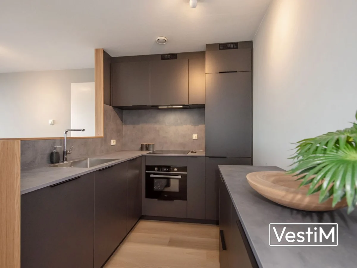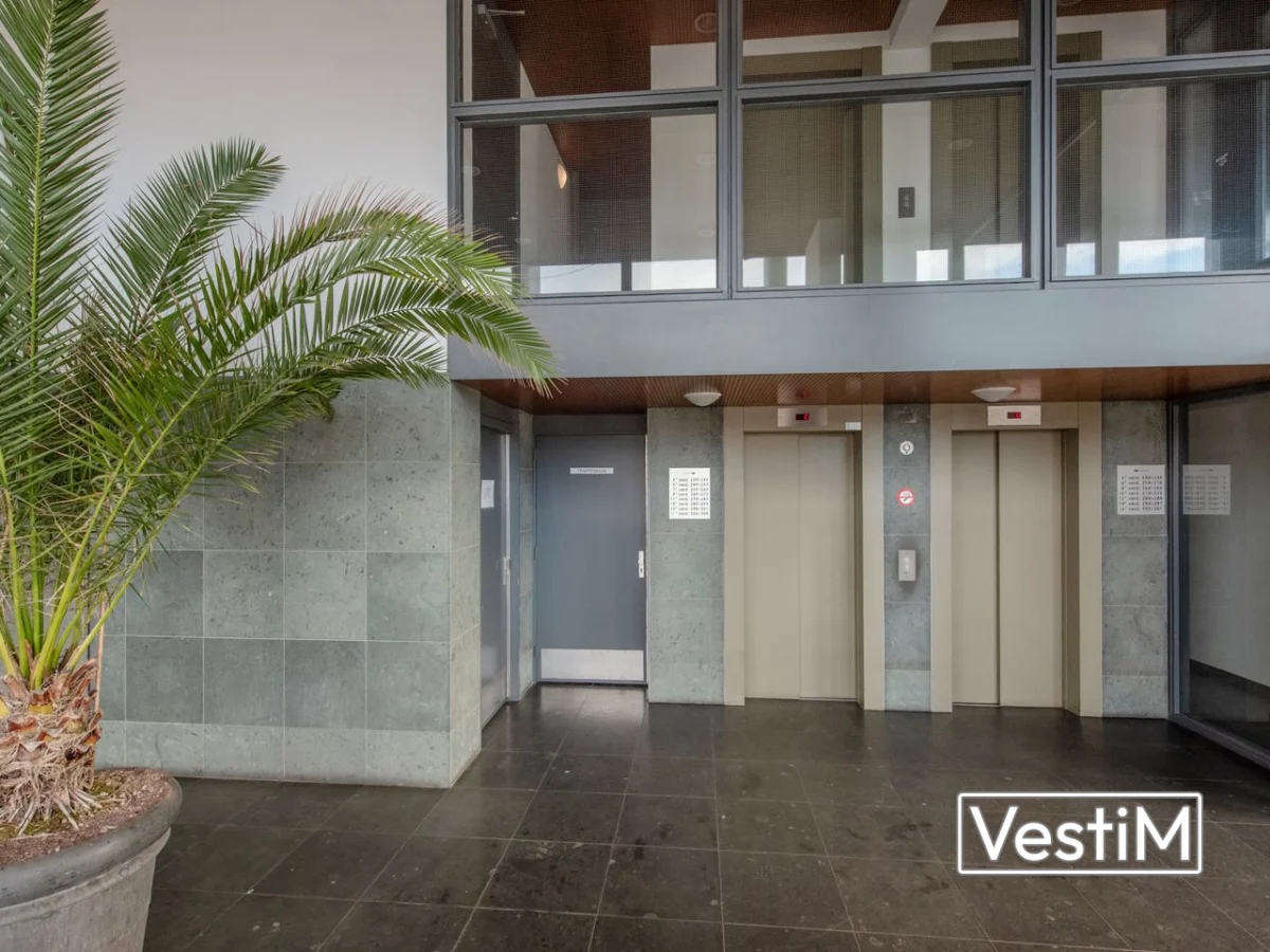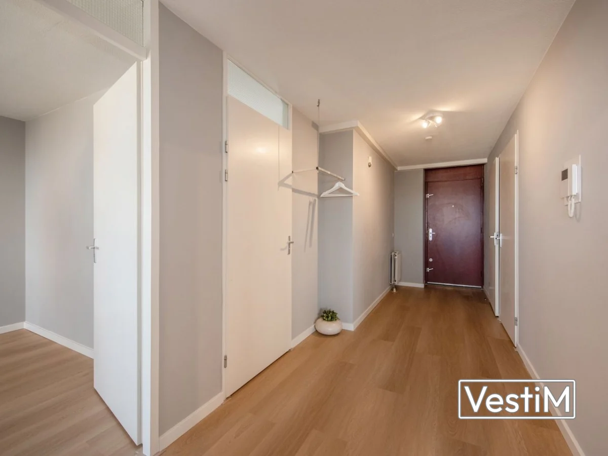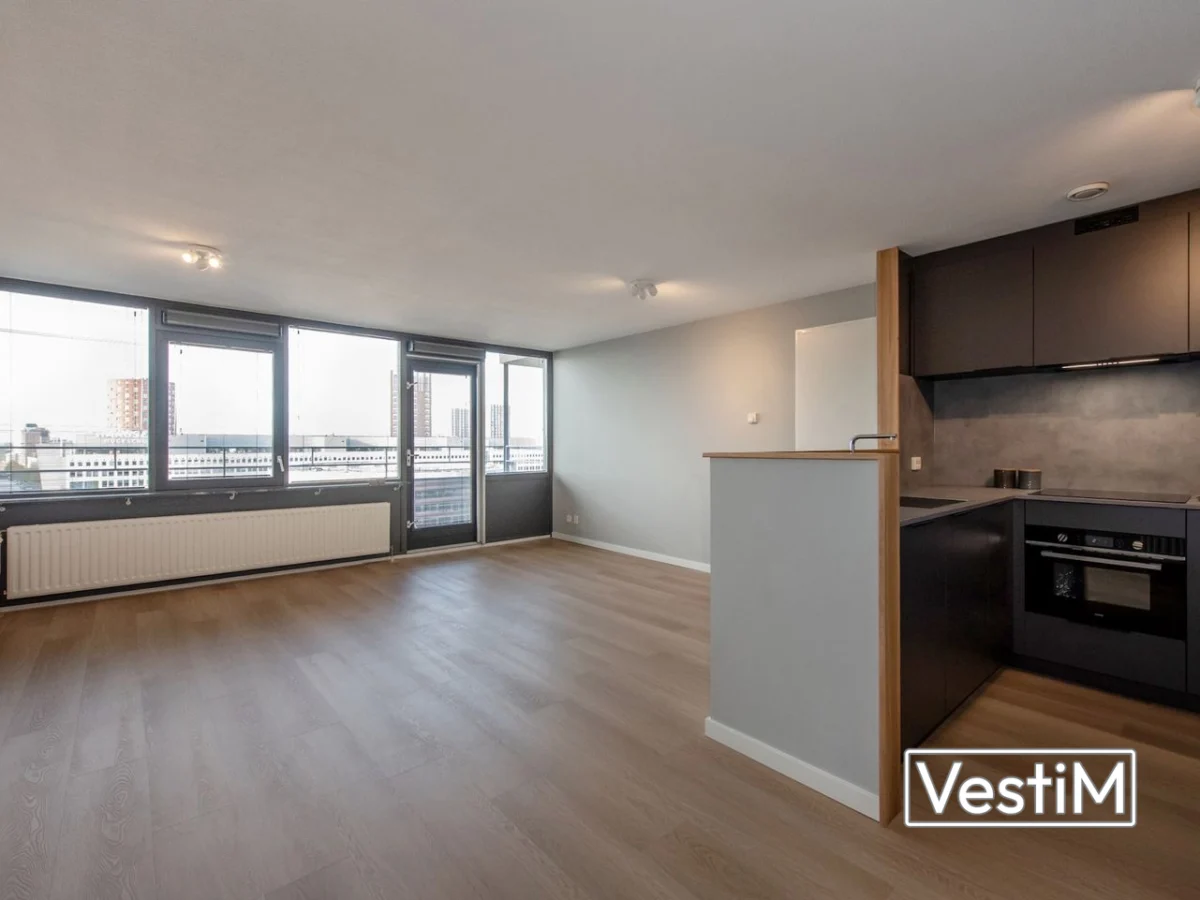 Representatieve entree met bellentableau, brievenbussen en twee liften. U stapt de woning binnen in een ruime hal met garderobe, technische/bergruimte met wasmachineaansluiting, stadsverwarmingsunit en mv-box, en een separaat toilet. Lichte living met grote raampartijen en toegang tot het zonnige balkon (zuidwest). Luxe open keuken (2025) in L-opstelling, uitgevoerd in donkergrijs/zwart met hout, voorzien van inductiekookplaat, combimagnetron, afzuigkap, geïntegreerde vaatwasser, koel-vriescombinatie, grote spoelbak en 10-liter close-in boiler. Twee slaapkamers aan de zuidwestzijde, waaronder een royale master en een multifunctionele tweede kamer. Nieuwe badkamer (2025) met dubbel wastafelmeubel en royale inloopdouche met glaswand, hand- en regendouche.
