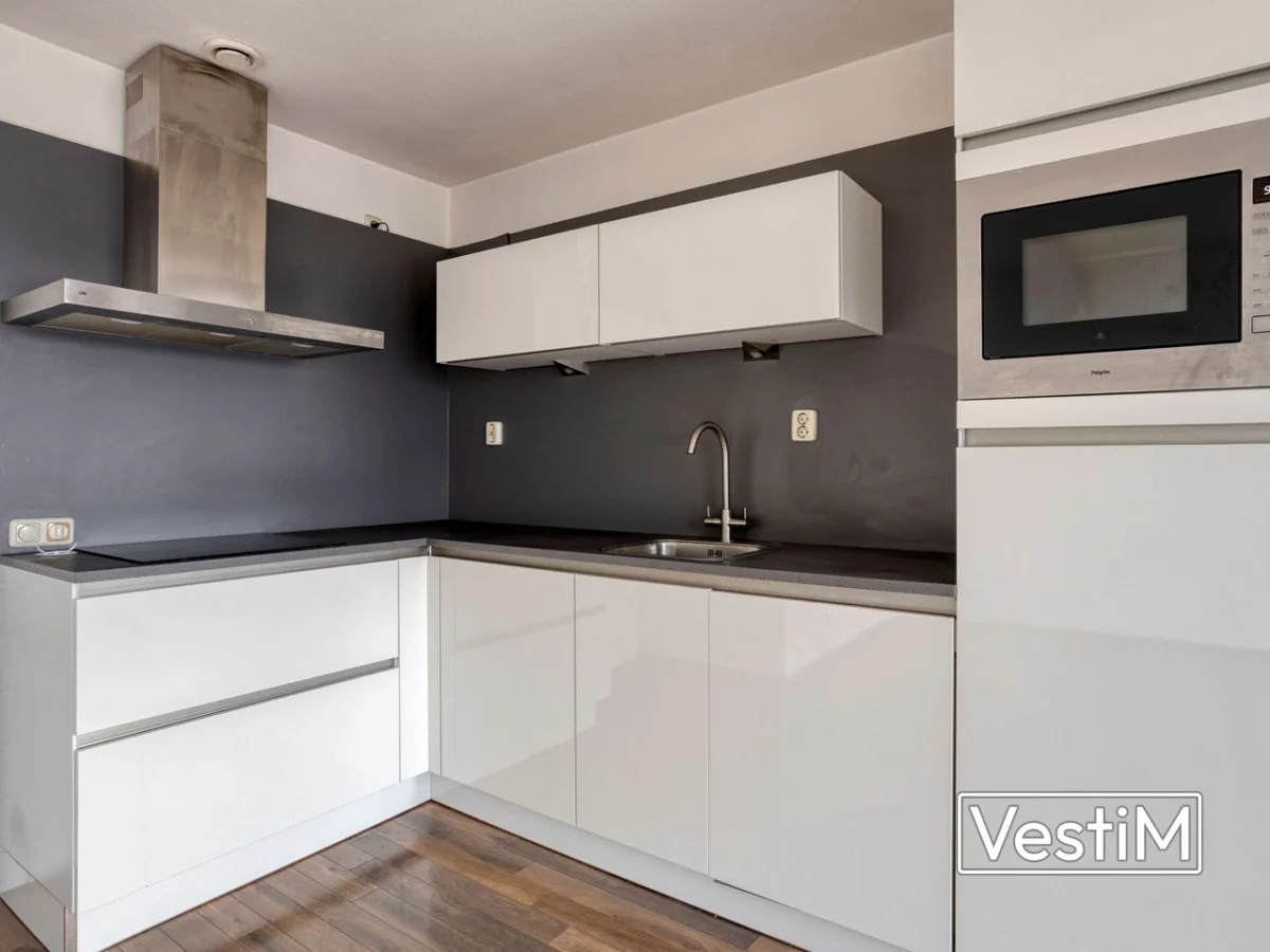 Indeling: via de gesloten entree met videofoon bereikt u de trapopgang en de kelder met de privéberging. De centrale hal van de woning geeft toegang tot alle vertrekken. De woonkamer is licht dankzij grote raampartijen en heeft een open keuken. Vanuit de woonkamer is er directe toegang tot het balkon (circa 6 m²). De moderne keuken in L-opstelling is compleet uitgevoerd met inductiekookplaat, afzuigkap, vaatwasser, koelkast en combimagnetron. Er zijn twee slaapkamers, waarvan één royale hoofdslaapkamer en één ideale werk- of logeerkamer. De strak afgewerkte, volledig betegelde badkamer beschikt over een inloopdouche met thermostaatkraan, wastafelmeubel en aansluiting voor de wasmachine. Het toilet is separaat en modern uitgevoerd. Het gehele appartement is voorzien van een nette laminaatvloer.