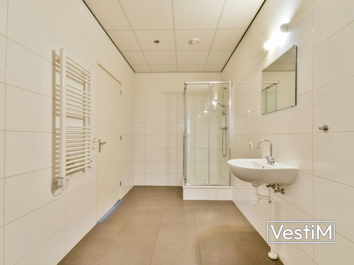 - Badkamer met douchecabine en wastafelmeubel