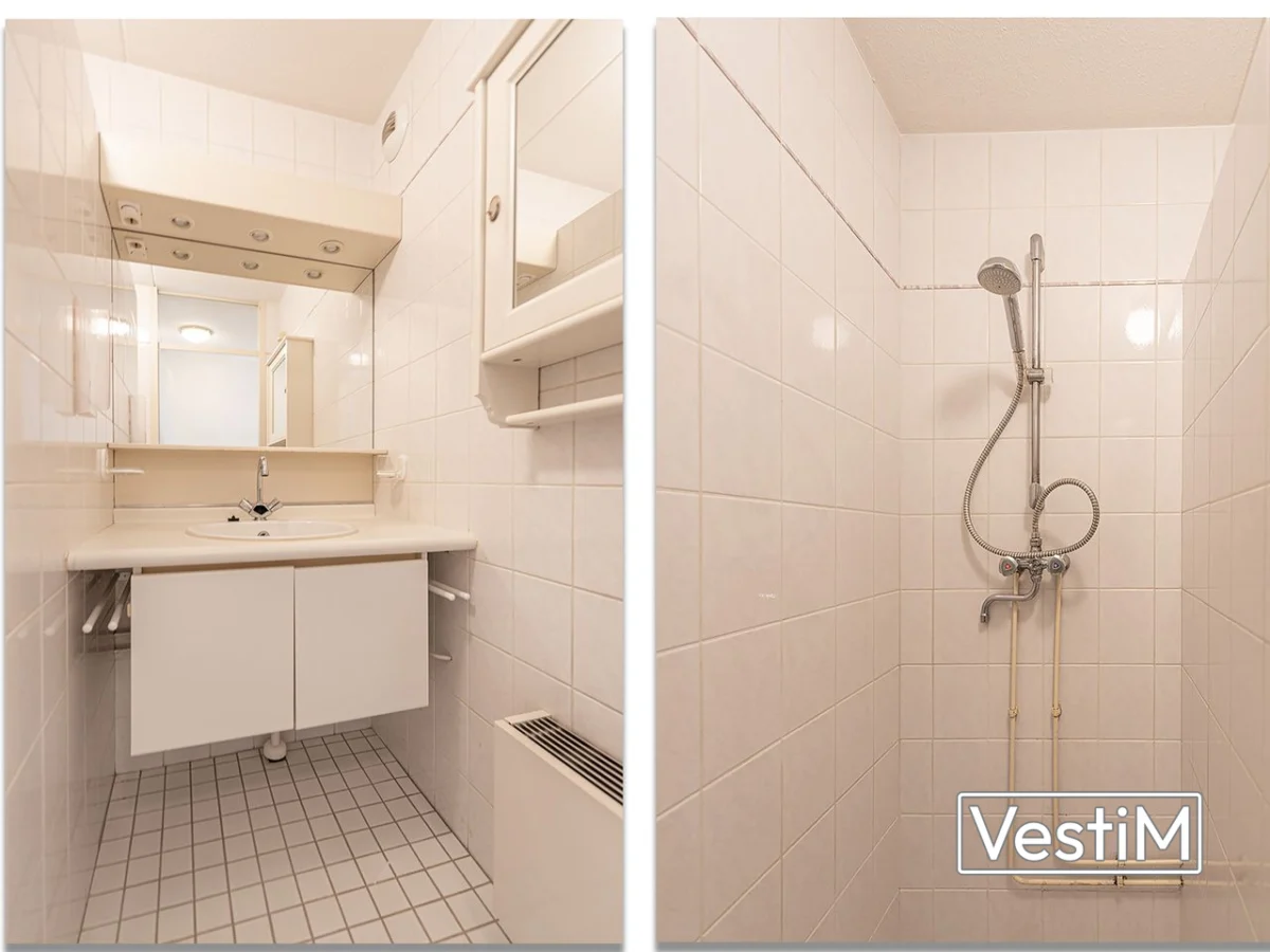 - Badkamer met douche en wastafelmeubel