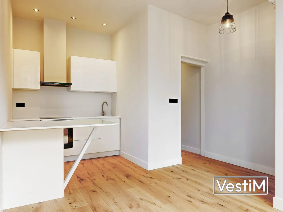 Indeling: entree naar een lichte woonkamer met nieuwe houten vloer en strak afgewerkte wanden en plafonds. De moderne open keuken is uitgerust met inbouwapparatuur: vaatwasser, inductiekookplaat met afzuigkap, oven en koelkast. Via een tussenhal met ruime inbouwkast bereikt u het separate toilet met fonteintje, de slaapkamer en de badkamer. De slaapkamer beschikt over twee inbouwkasten en openslaande deuren naar het beschutte plaatsje. De badkamer is ingericht met een douchecabine en een wastafelmeubel; hier bevindt zich tevens de aansluiting voor de wasmachine.