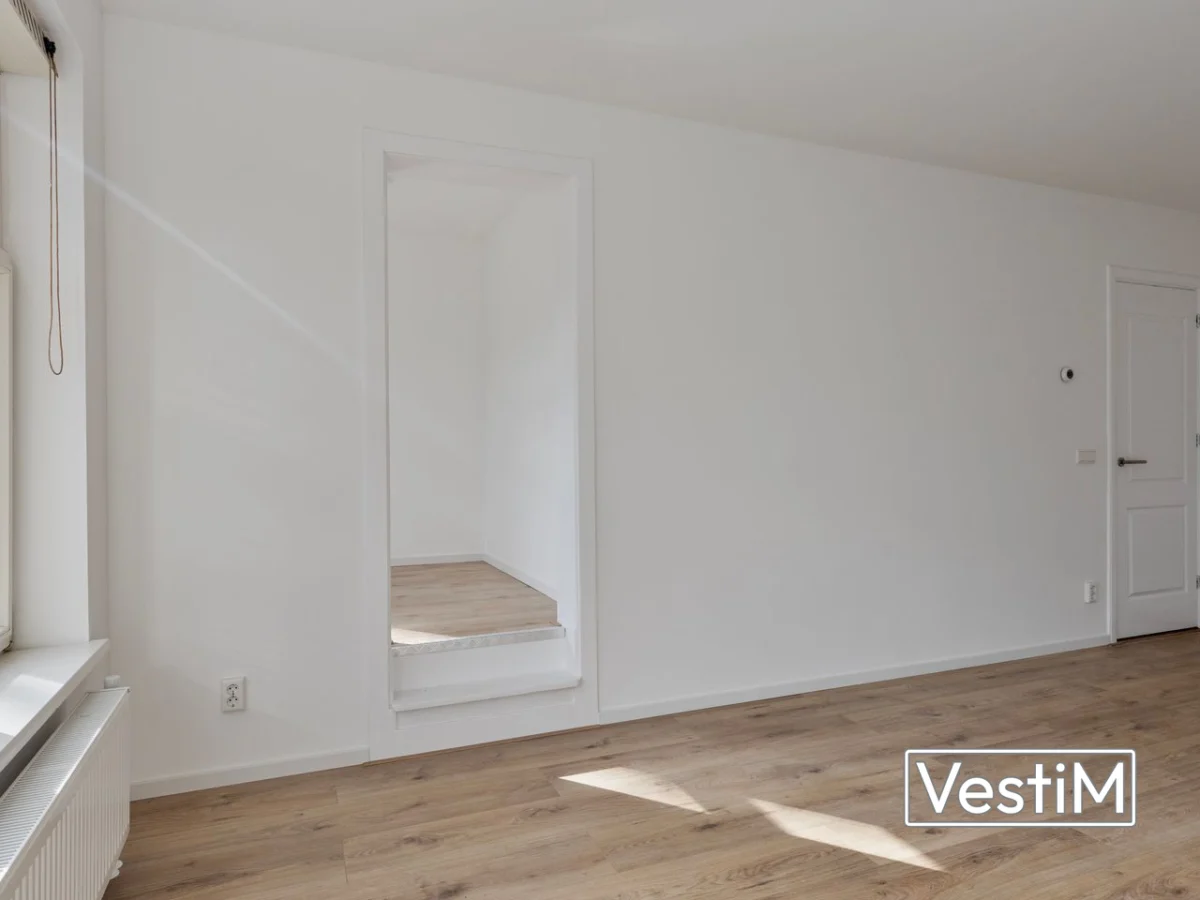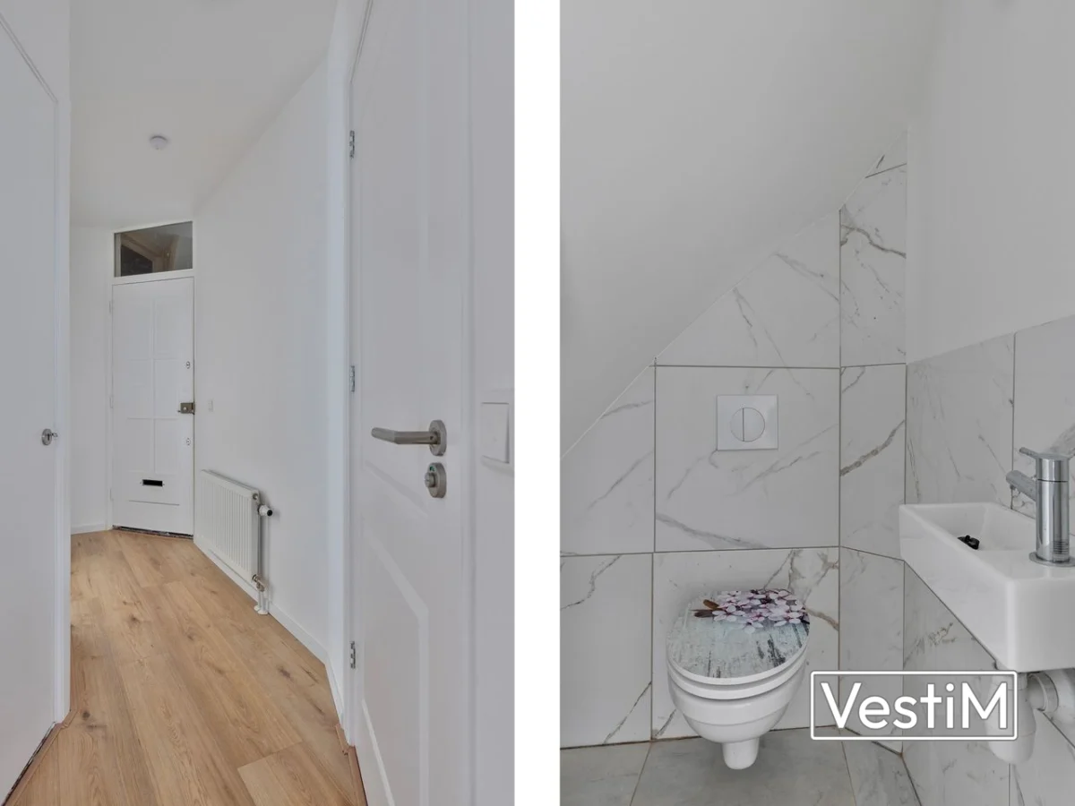 - Houten vloer door de gehele woning; glad gestucte wanden
