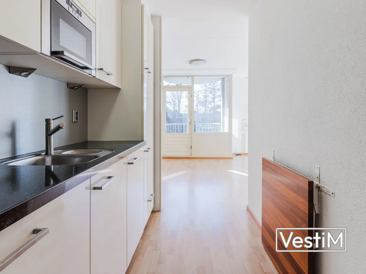 Indeling: via de gesloten entree met bel/intercom bereikt u per trap of lift het appartement op de eerste verdieping. De langwerpige hal geeft toegang tot alle vertrekken. De lichte woonkamer met grote ramen grenst aan het balkon op het zuiden. De open keuken in rechte opstelling is netjes en voorzien van een gasfornuis, koelkast en magnetron. Er is één ruime slaapkamer. De badkamer heeft een inloopdouche en wastafelmeubel, plus aansluitingen voor wasmachine en droger. Het toilet met fonteintje is separaat. In vrijwel het hele appartement ligt laminaat; de slaapkamer is voorzien van vloerbedekking. Rondom het complex is parkeergelegenheid en in de onderbouw is een eigen berging met elektra aanwezig.