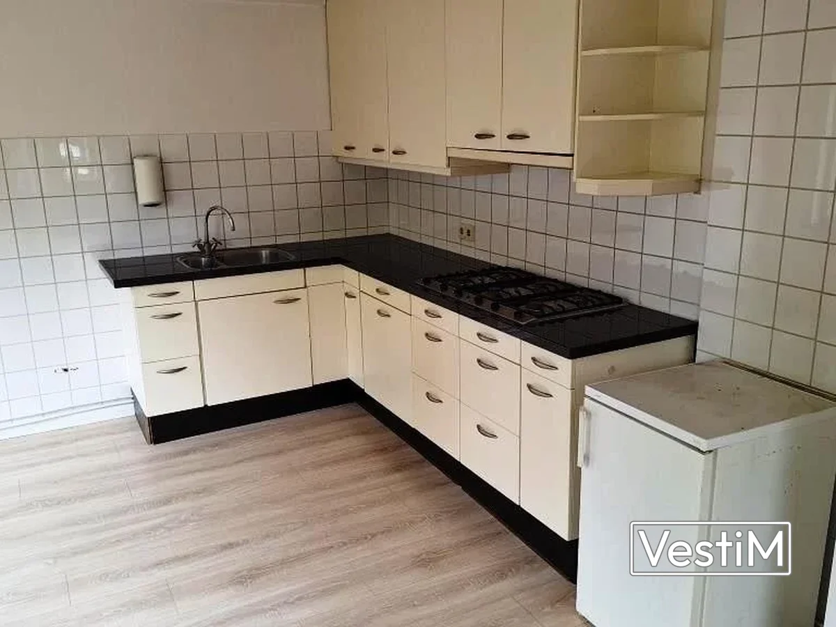 De woonkamer heeft een ruime open keuken in hoekopstelling met veel kastruimte en werkblad. De keuken is voorzien van een zes pits gasfornuis met afzuigkap en aansluitingen voor een koel-vriescombinatie en vaatwasser.