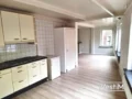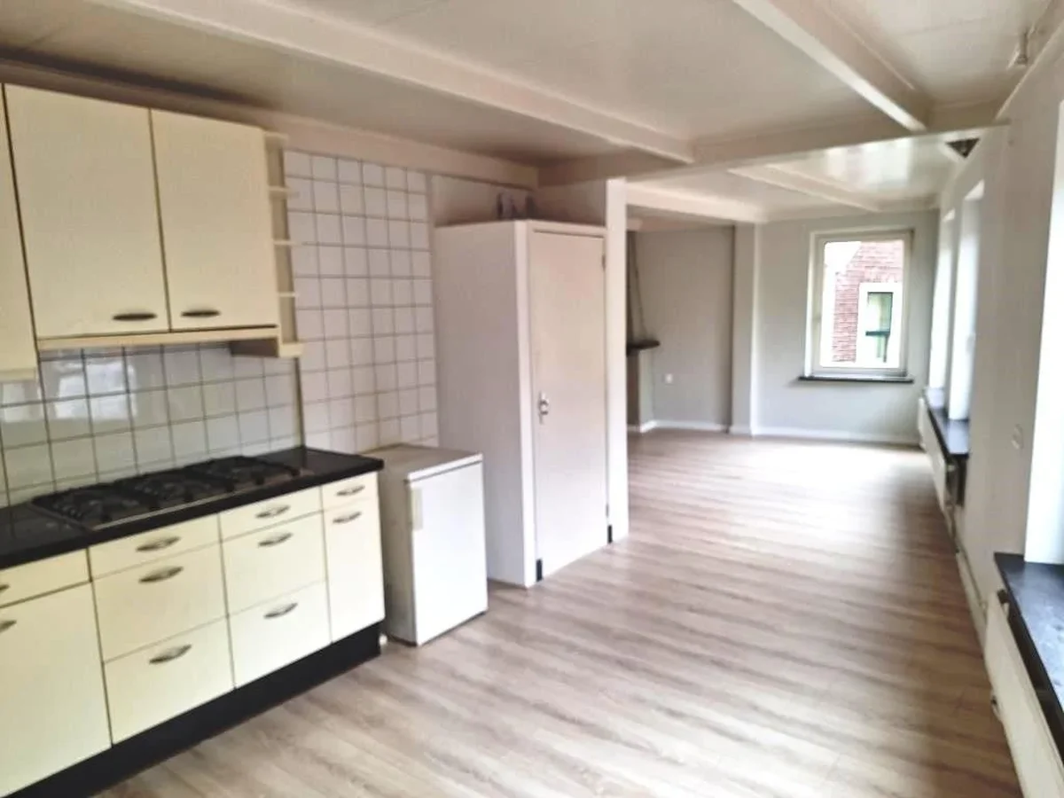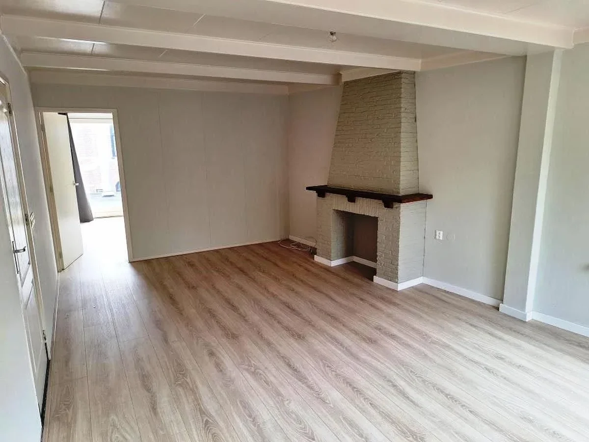 De L-vormige woonkamer met open keuken heeft een sierschouw, nieuwe laminaat en door de grote raampartijen heeft u een fraai uitzicht over de straat.