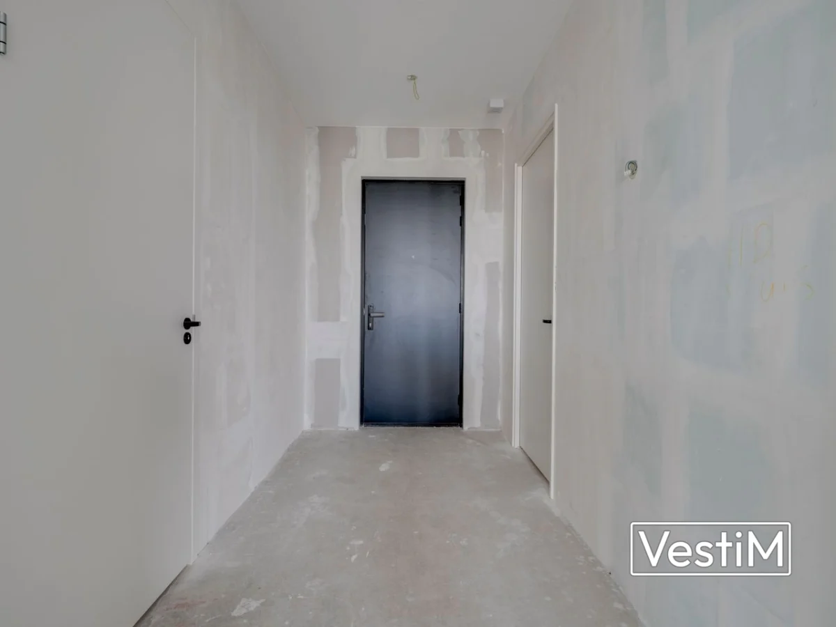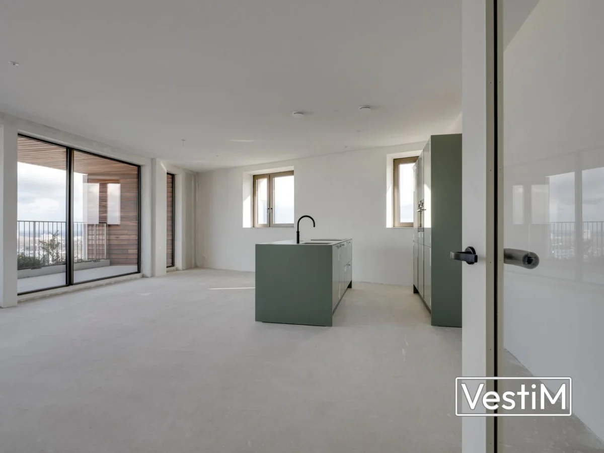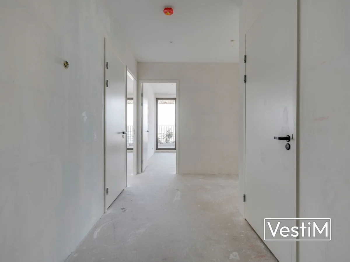 De hal geeft toegang tot alle vertrekken. De royale woonkamer profiteert van grote raampartijen aan voor- en zijkant en staat in open verbinding met de moderne keuken met kastenwand, kookeiland, inductiekookplaat met geïntegreerd afzuigsysteem en Quooker. Er zijn twee volwaardige slaapkamers (circa 12 m² en 18 m²), waarvan beide toegang hebben tot het eerste balkon. De badkamer in Wonderwoods-stijl beschikt over een ligbad, inloopdouche, brede wastafel met meubel, spiegel en handdoekradiator. Er is een separaat toilet. De technische ruimte biedt plaats aan wasmachine en droger en extra bergruimte. Het tweede, grotere balkon grenst aan de woonkamer en kijkt uit over de stad en de Dom.