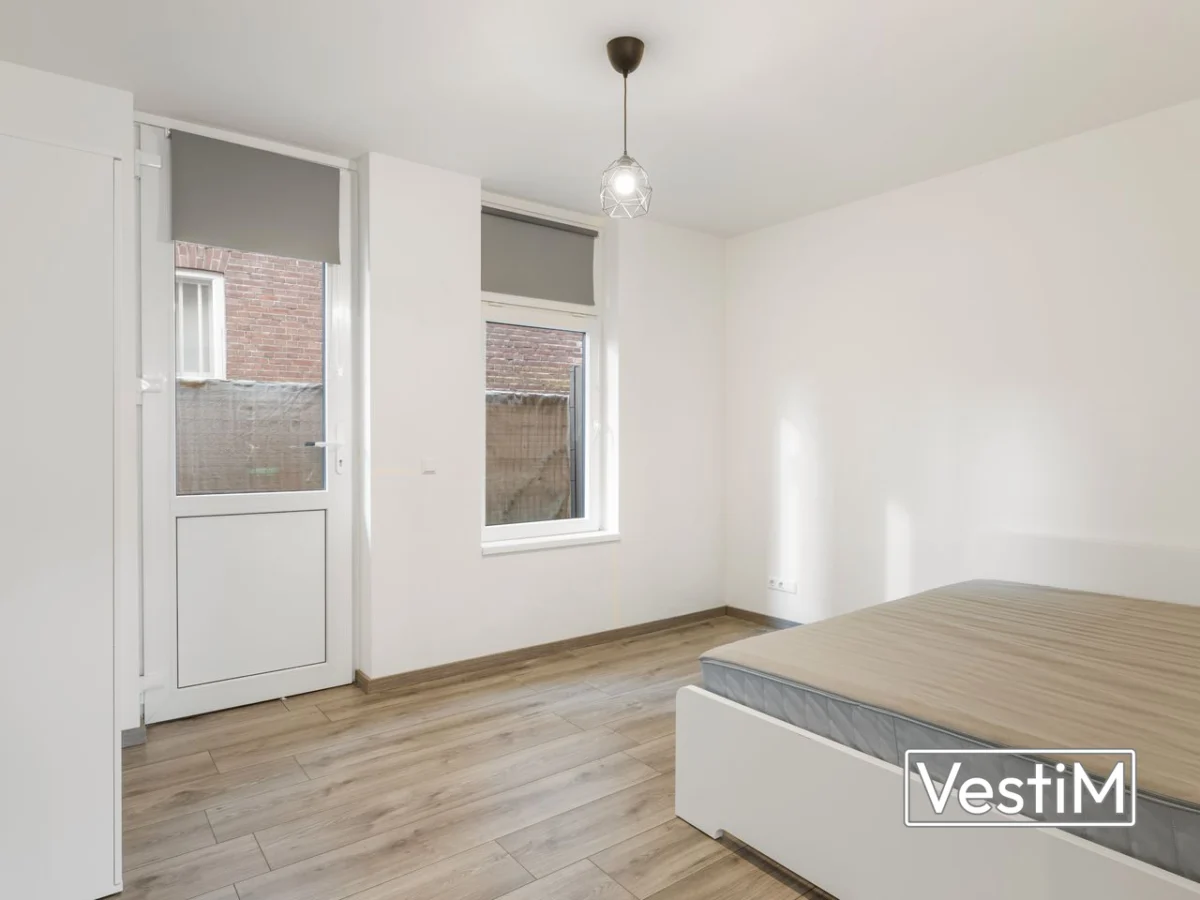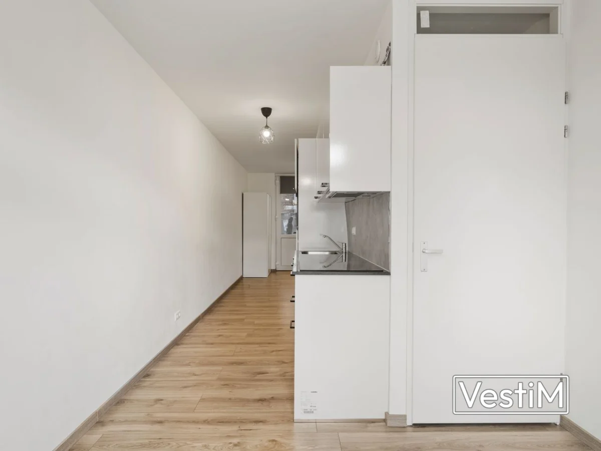 Via de gezamenlijke entree bereikt u het appartement. U stapt binnen in een lichte woon-/slaapruimte met een nette laminaatvloer. De open keuken is uitgerust met een inductiekookplaat, afzuigkap, vaatwasser, combi-oven en ingebouwde koelkast. De moderne badkamer beschikt over een douche, wastafelmeubel en toilet. Aan de achterzijde biedt een deur toegang tot de achtertuin, ideaal voor buiten zitten.