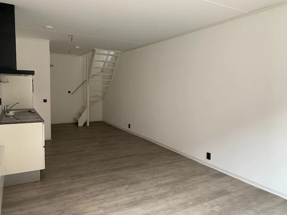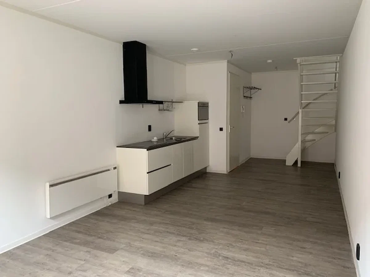 Bij binnenkomst in het complex treft u een gezamenlijke entree met bellentableau en brievenbussen. Het appartement zelf opent met een ruime woon-eetkamer op de begane grond, waar een open hoogglans witte keuken is ingericht met moderne apparatuur, zoals een koelkast met vriezer, spoelbak, 4-pits kookplaat, afzuigkap, combi-oven/magnetron en vaatwasser. De kamer baadt in natuurlijk licht dankzij de hoge ramen. Vanuit de woonkamer heeft u toegang tot een charmant tuintje. Ook zijn er een aparte wasruimte en toiletruimte met fonteintje. Een trap leidt naar de eerste verdieping, waar een elegante slaapkamer met half open luxe inloopbadkamer te vinden is, uitgerust met een douche en wastafelmeubel. Hier bevindt zich ook een ruim dakterras met vele zonuren.