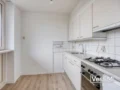 Woning: entree/hal met vaste kast, dichte keuken met inbouwkeuken en apparatuur, lichte L-vormige woonkamer met toegang tot het balkon, twee goed indeelbare slaapkamers, badkamer met douche en wastafel, en een separaat toilet. De hal verbindt alle vertrekken en biedt extra bergruimte, terwijl de slaapkamers rustig zijn gelegen.